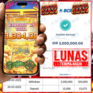 USER ID : 85**A1JAS DEPOSIT : Rp. 100.000 JACKPOT : Rp. 3.000.000 WITHDRAW : Rp. 3.000.000 Selamat kepada member SEJITU yang jackpot di games LUCKY…